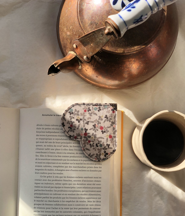 Les marque-page coeur sont cousus dans des tissus de récupération vintage ou contemporain à la main dans le Perche par...ma maman. Chaque découpe est unique et laisse voir des motifs différents.